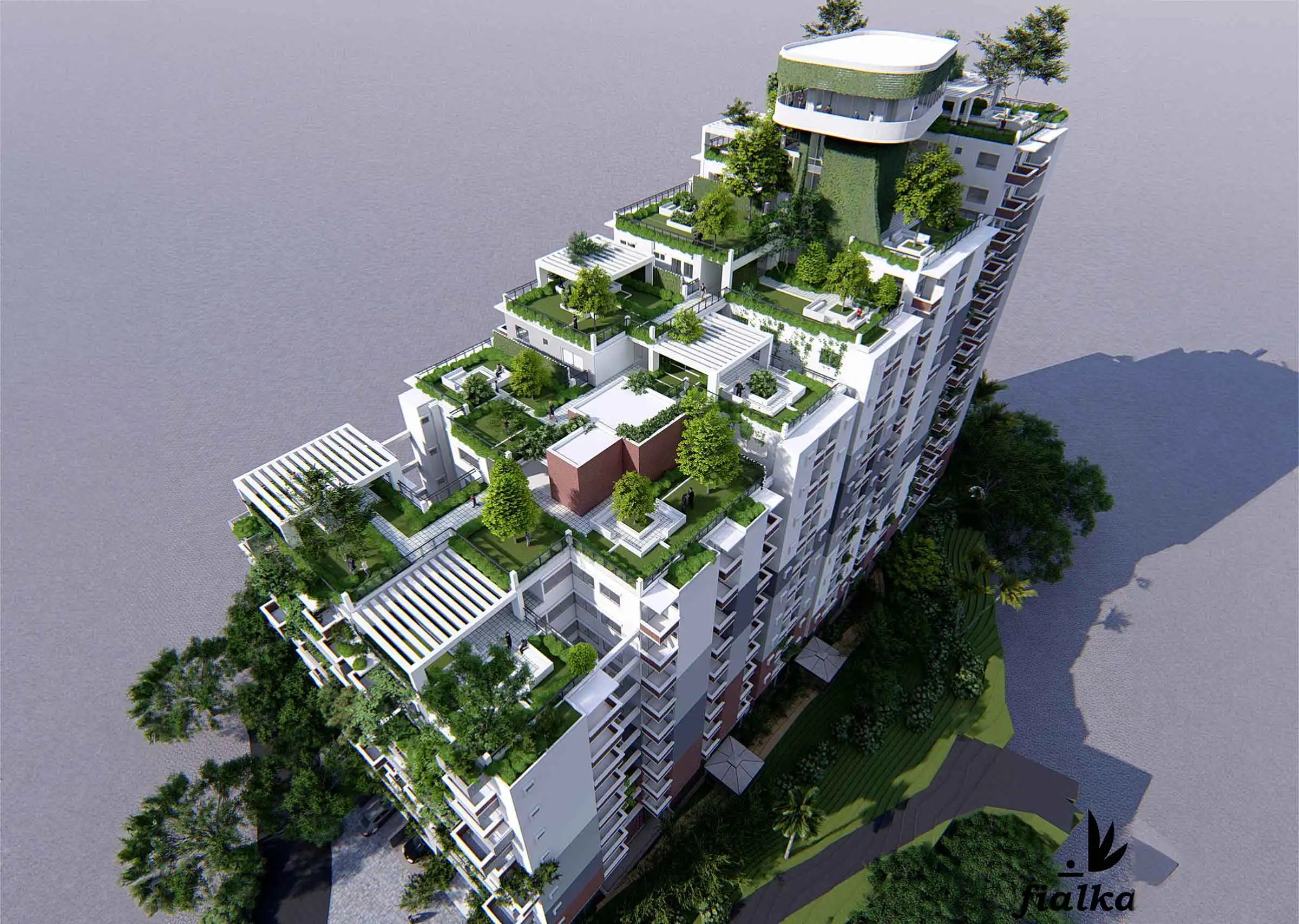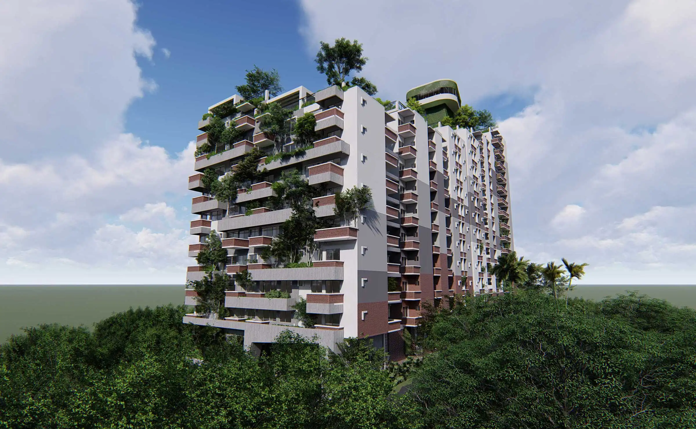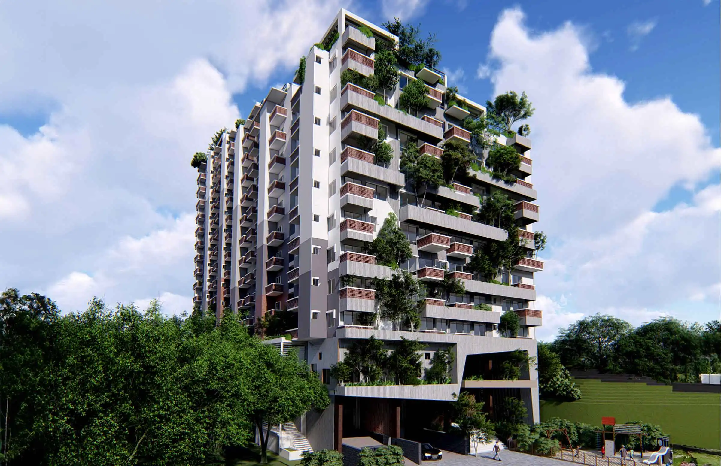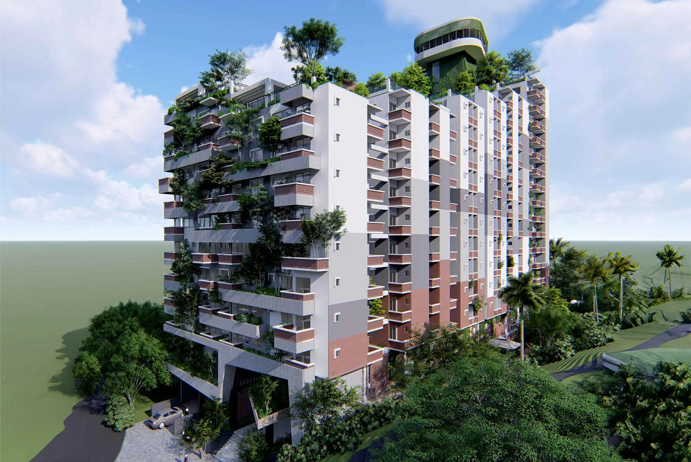Client: SM Builders This 17-story apartment building, including a semi-basement, features various amenities like a gymnasium, community space, super-shop, cinema hall, infinity swimming pool with a hill view, indoor games, and a kids' zone. The building houses 129 residential apartments, each with a green terrace for community gatherings. At the top, a watchtower offers a panoramic view of the Bay of Bengal and the surrounding hills, adding a distinctive touch to the project. The design incorporates ample fire stairs and rigorous fire-safety measures for enhanced safety.