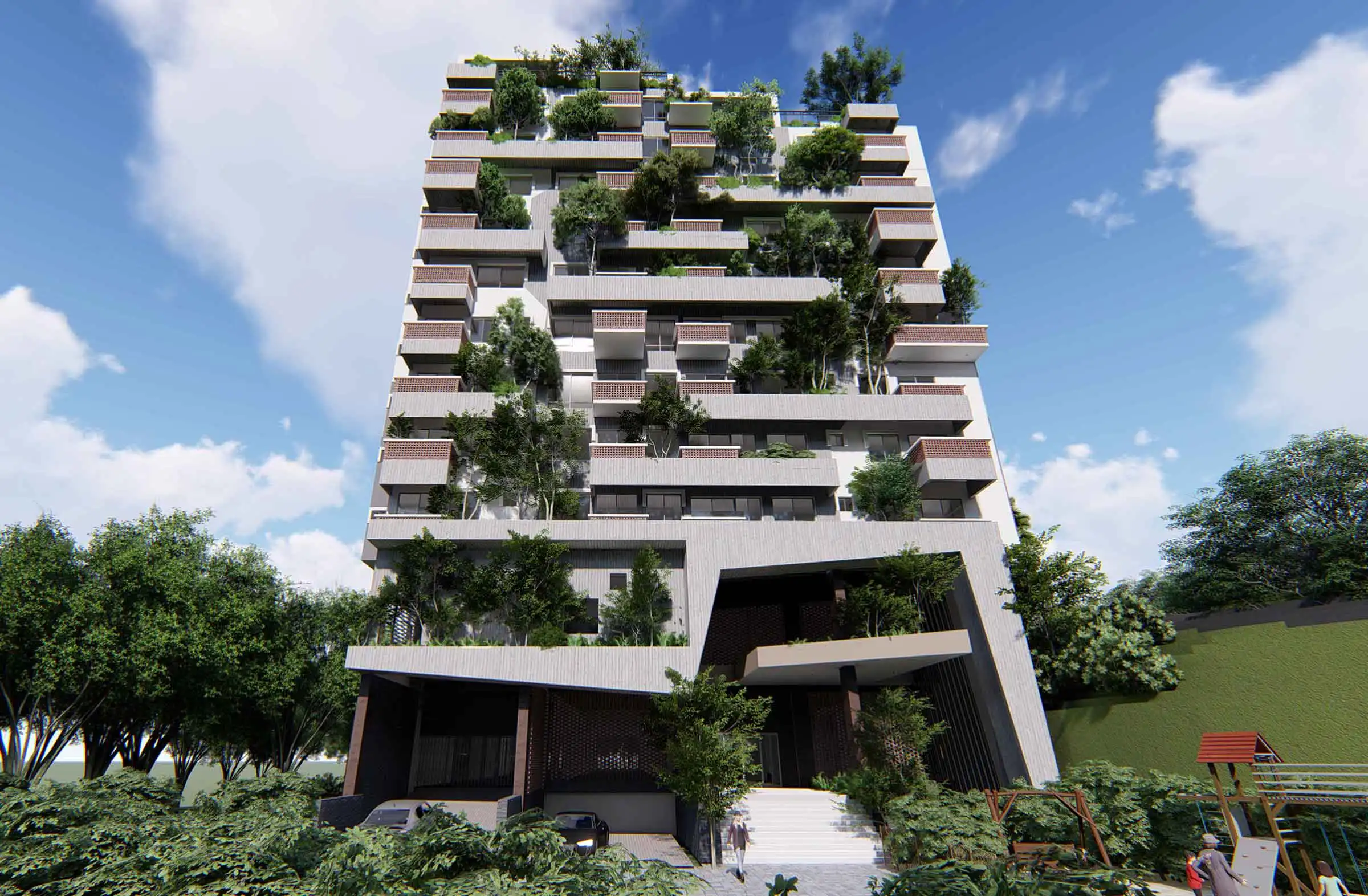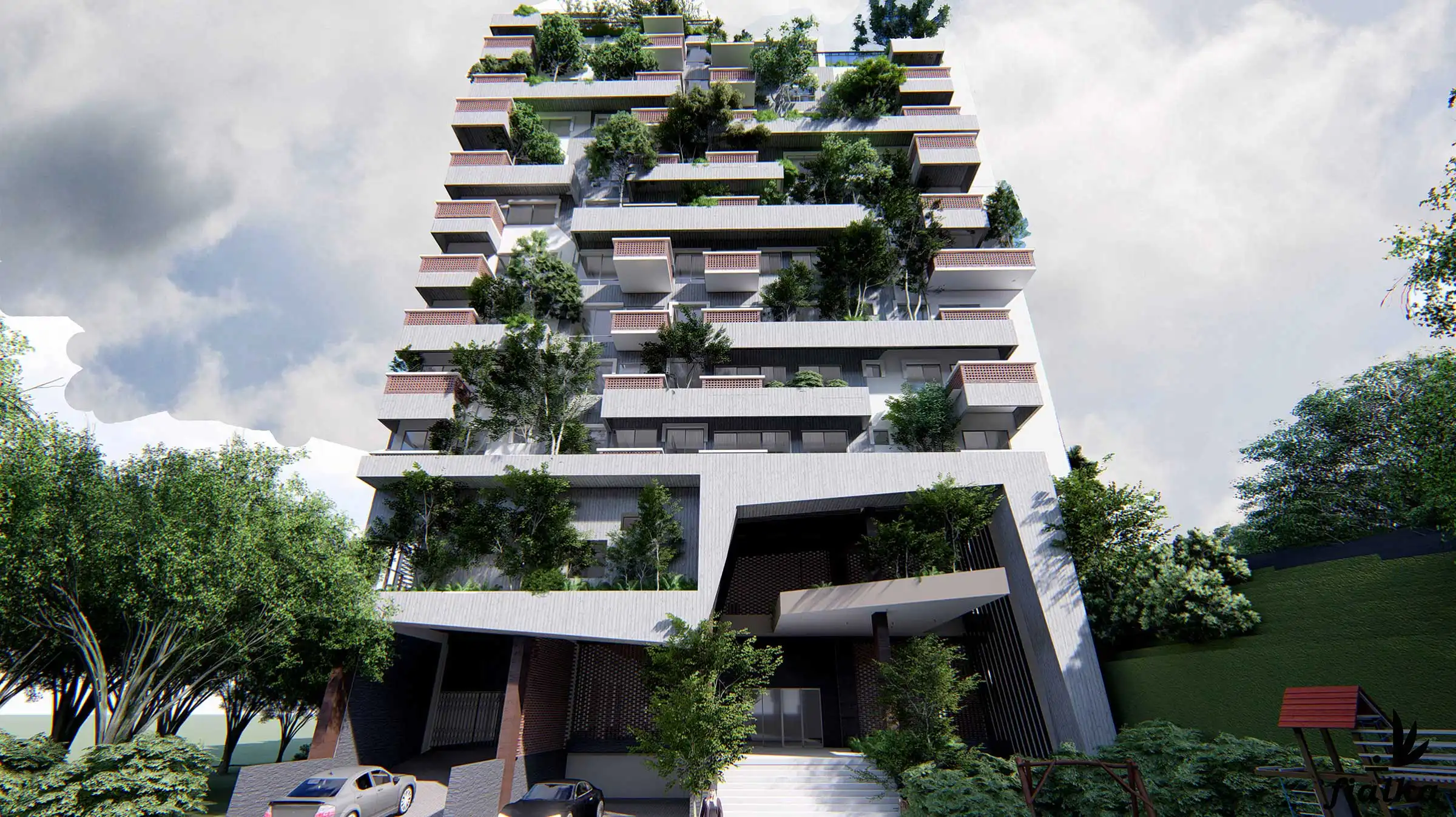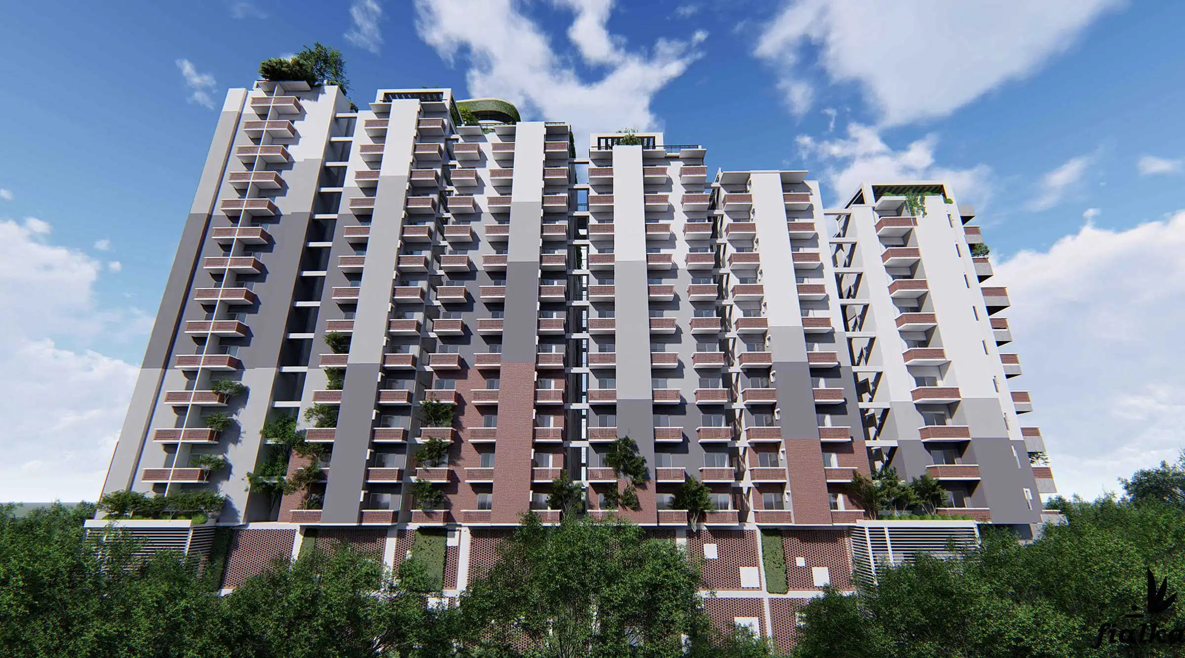 Client: SM Builders This 17-story apartment building, including a semi-basement, features various amenities like a gymnasium, community space, super-shop, cinema hall, infinity swimming pool with a hill view, indoor games, and a kids' zone. The building houses 129 residential apartments, each with a green terrace for community gatherings. At the top, a watchtower offers a panoramic view of the Bay of Bengal and the surrounding hills, adding a distinctive touch to the project. The design incorporates ample fire stairs and rigorous fire-safety measures for enhanced safety.