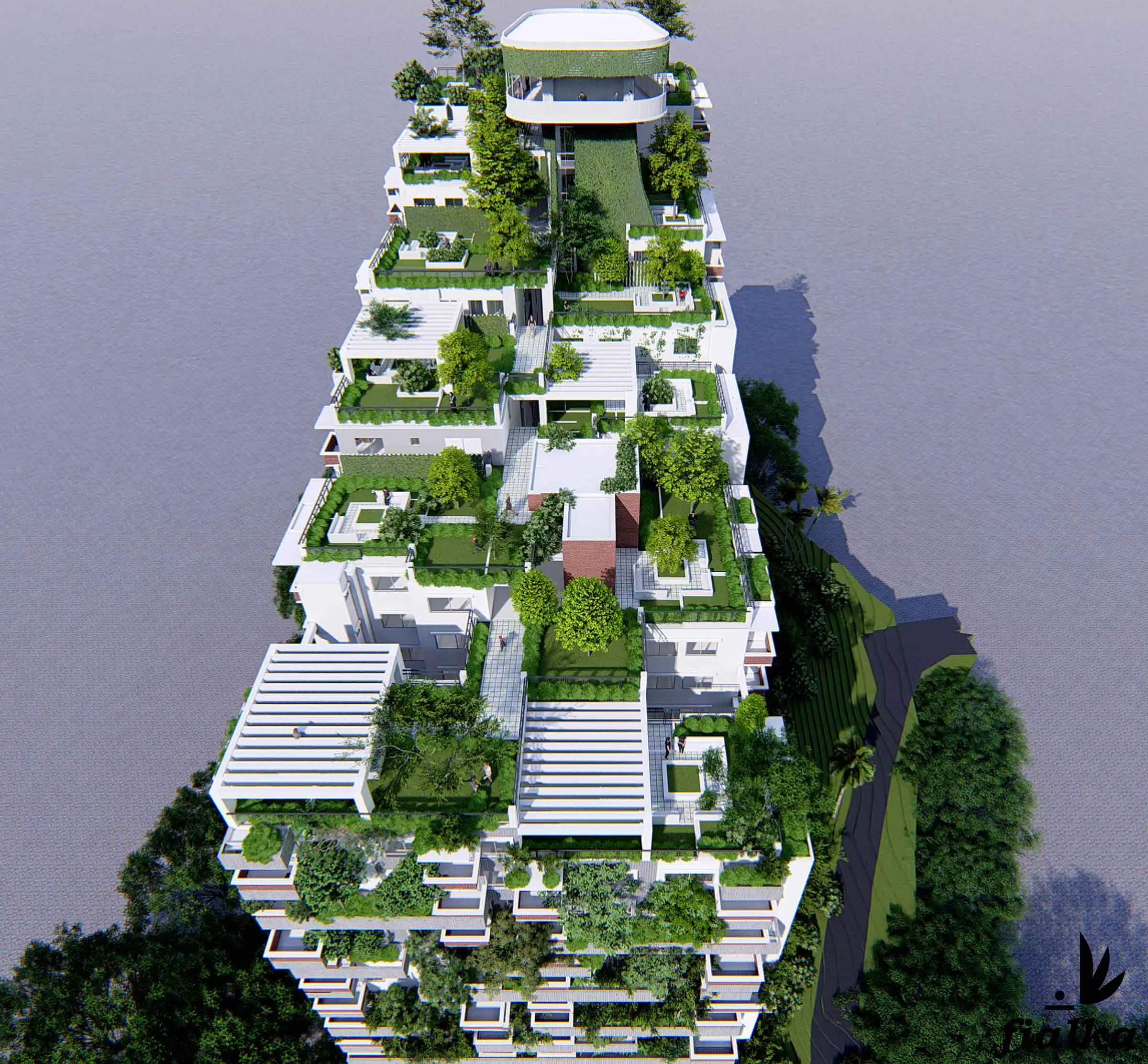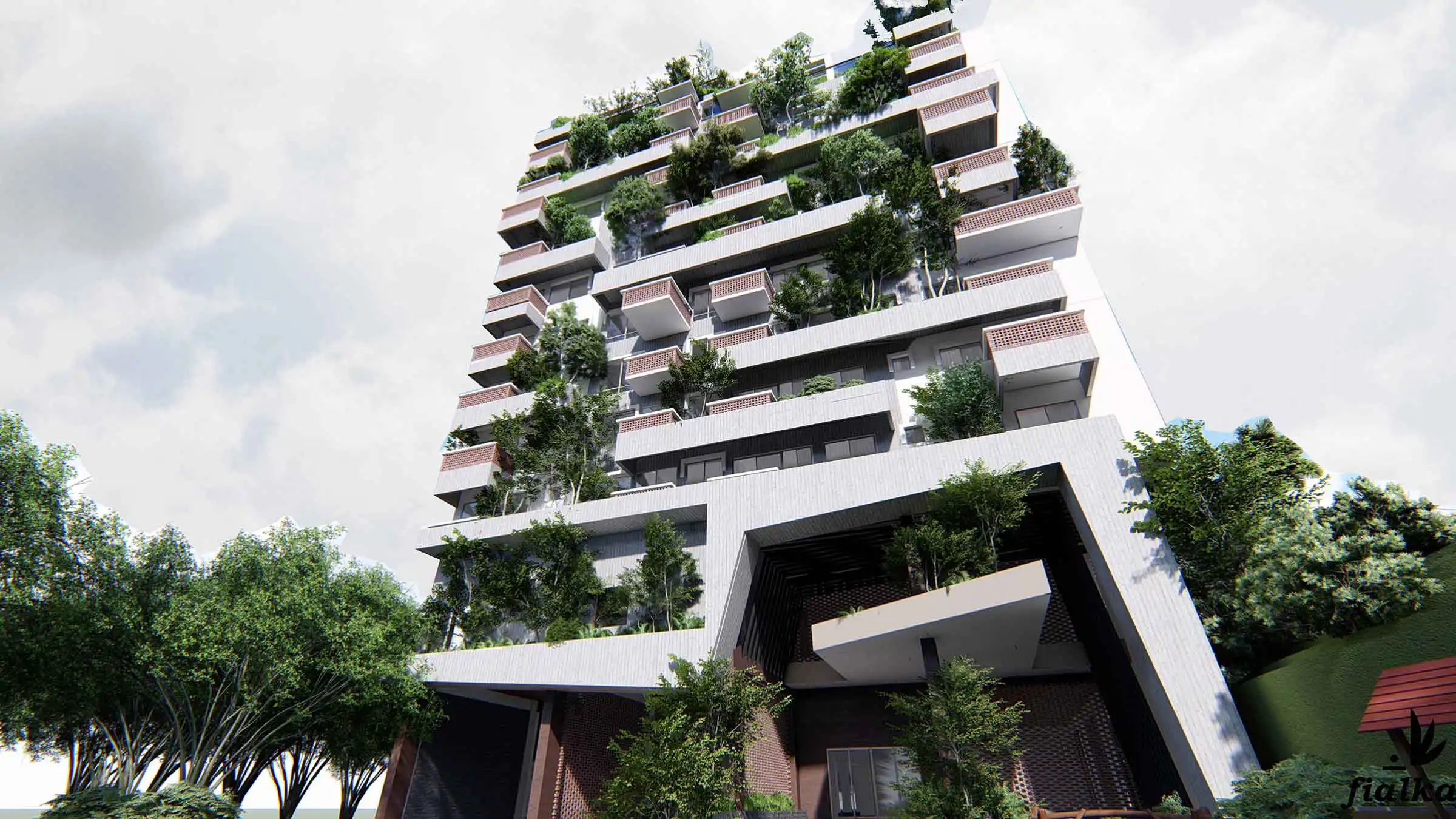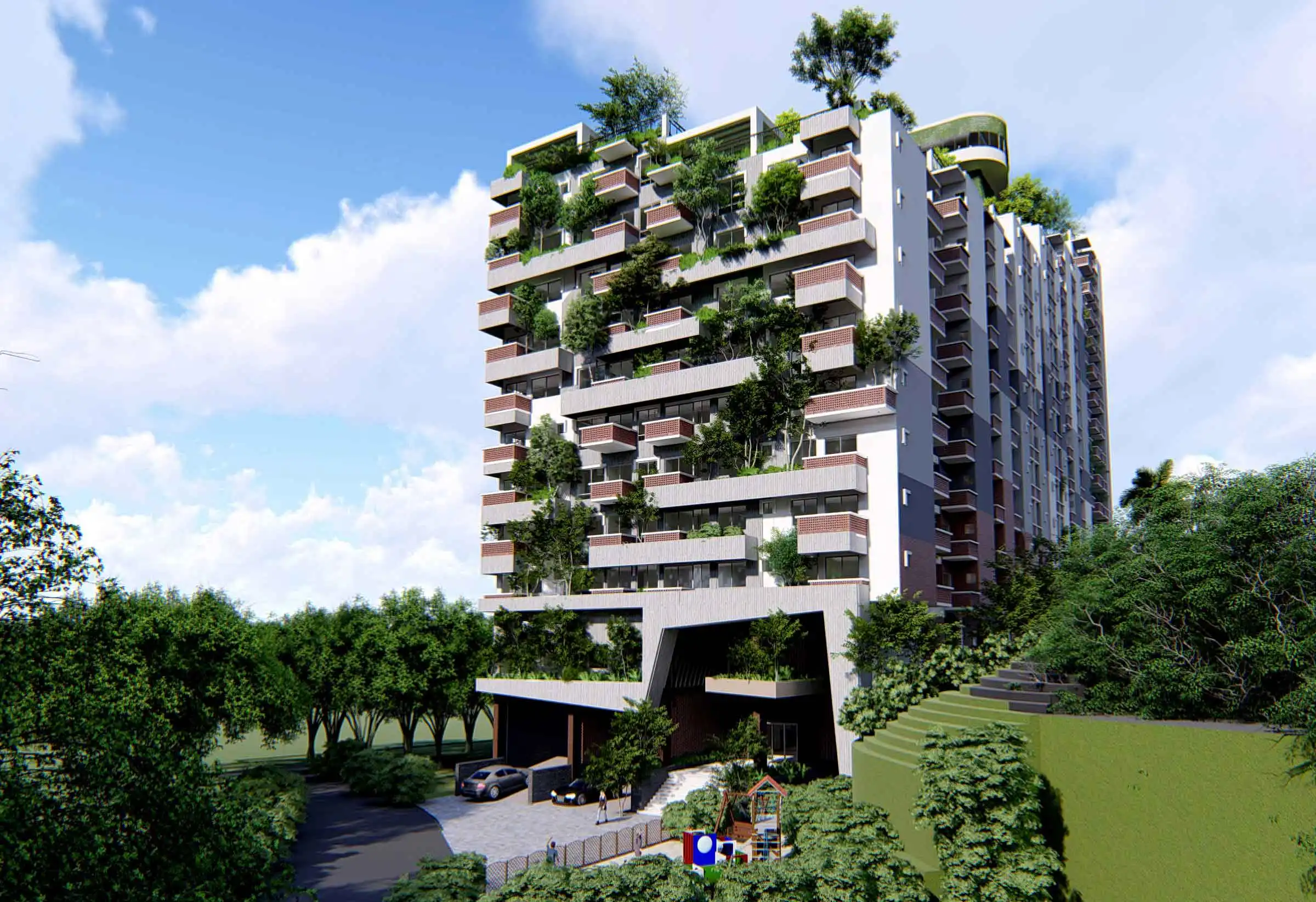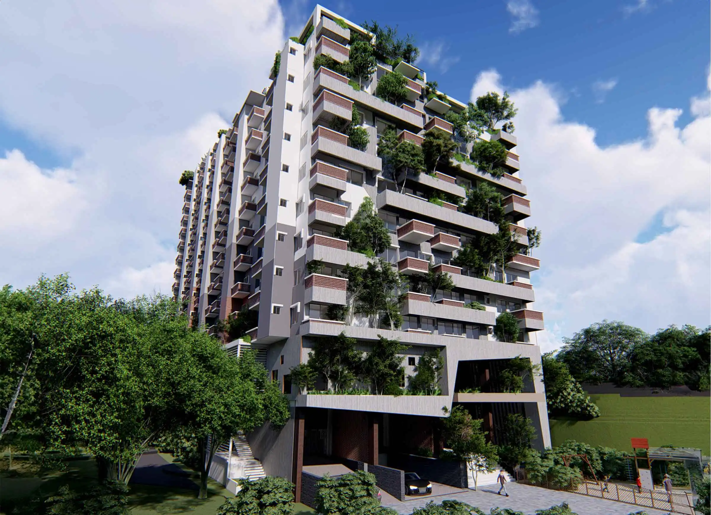Client: SM Builders This 17-story apartment building, including a semi-basement, features various amenities like a gymnasium, community space, super-shop, cinema hall, infinity swimming pool with a hill view, indoor games, and a kids' zone. The building houses 129 residential apartments, each with a green terrace for community gatherings. At the top, a watchtower offers a panoramic view of the Bay of Bengal and the surrounding hills, adding a distinctive touch to the project. The design incorporates ample fire stairs and rigorous fire-safety measures for enhanced safety.