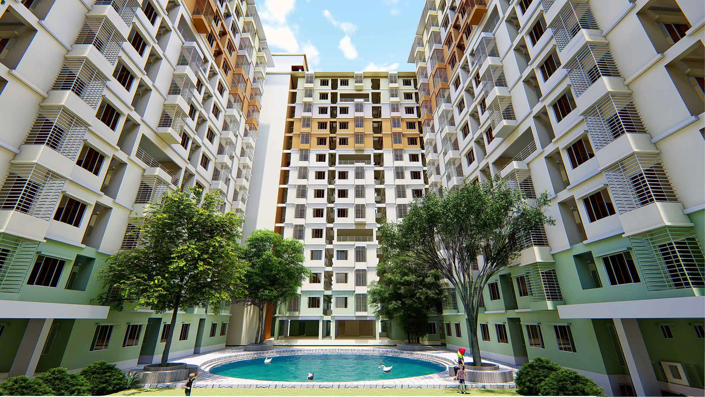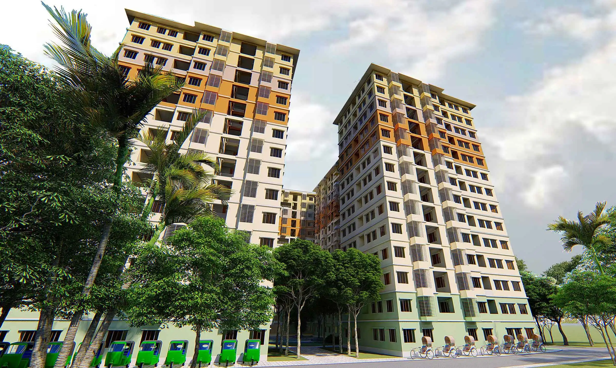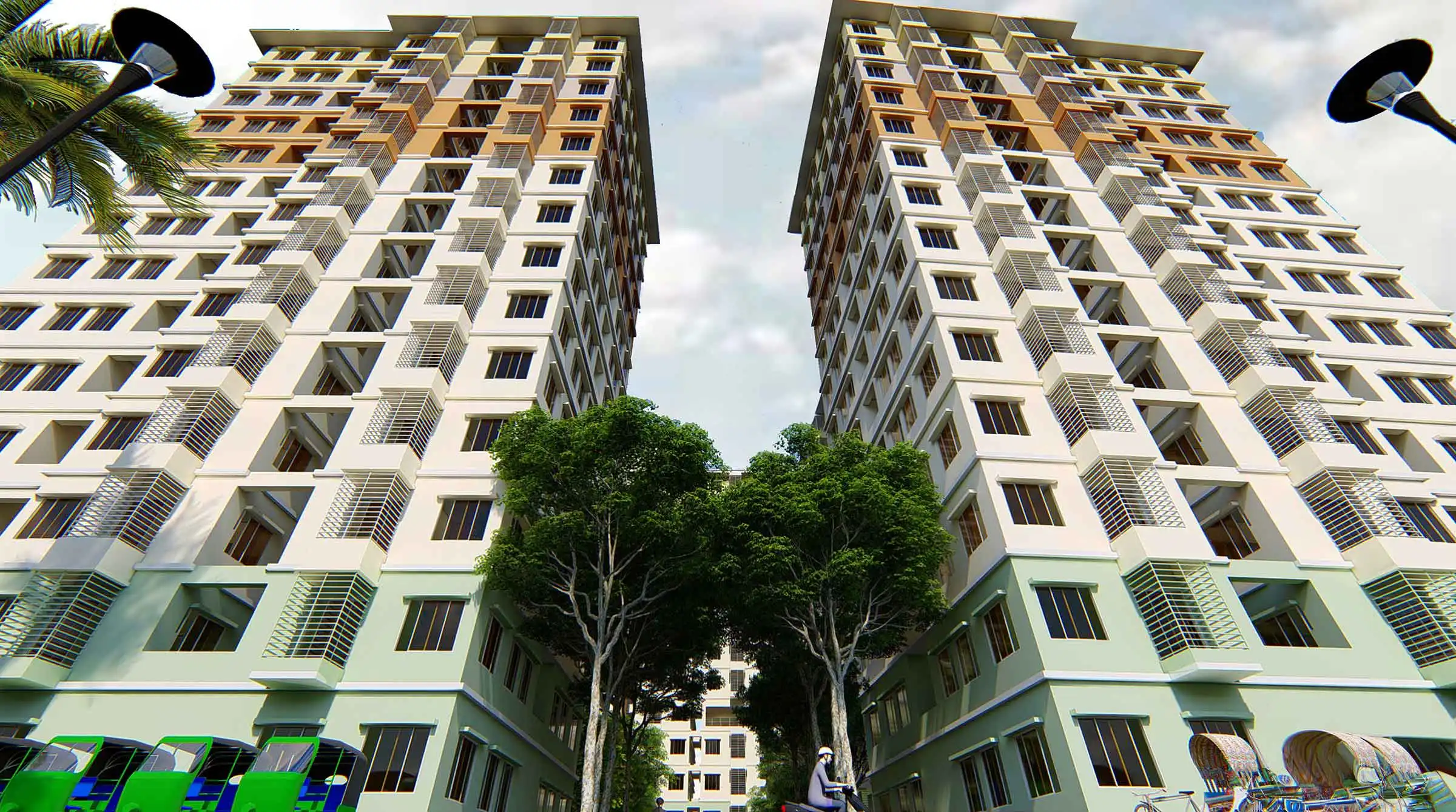 Client: Chattogram City Corporation There are three buildings, comprising two types, totaling 559 units. Each residential unit, measuring 435 sqft, features two bedrooms, an attached living cum dining space, a kitchen, one bath, and one toilet. The design prioritizes natural light and ventilation, achieved through comprehensive environmental simulations. Additionally, the ground floor accommodates a school and a community hall. A central open courtyard with a waterbody serves as a recreational space and also functions as a safety measure in the event of a fire breakout. Auto-rickshaw and rickshaw parking are conveniently provided at the entry point, ensuring accessibility. The overall design emphasizes fire safety, taking into account the number of residents and their well-being.