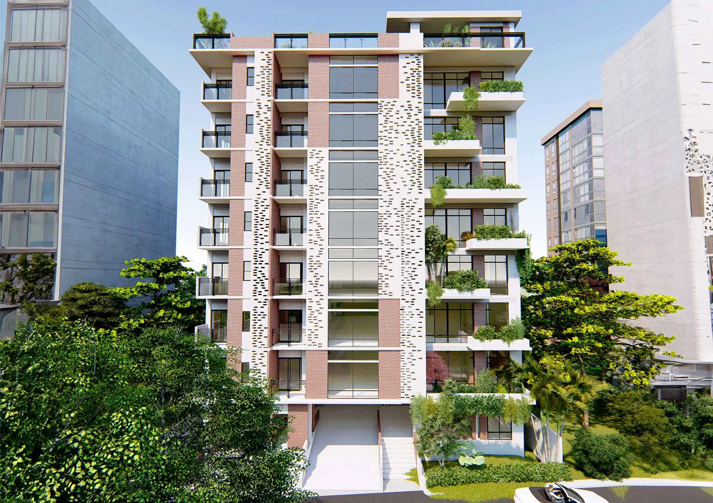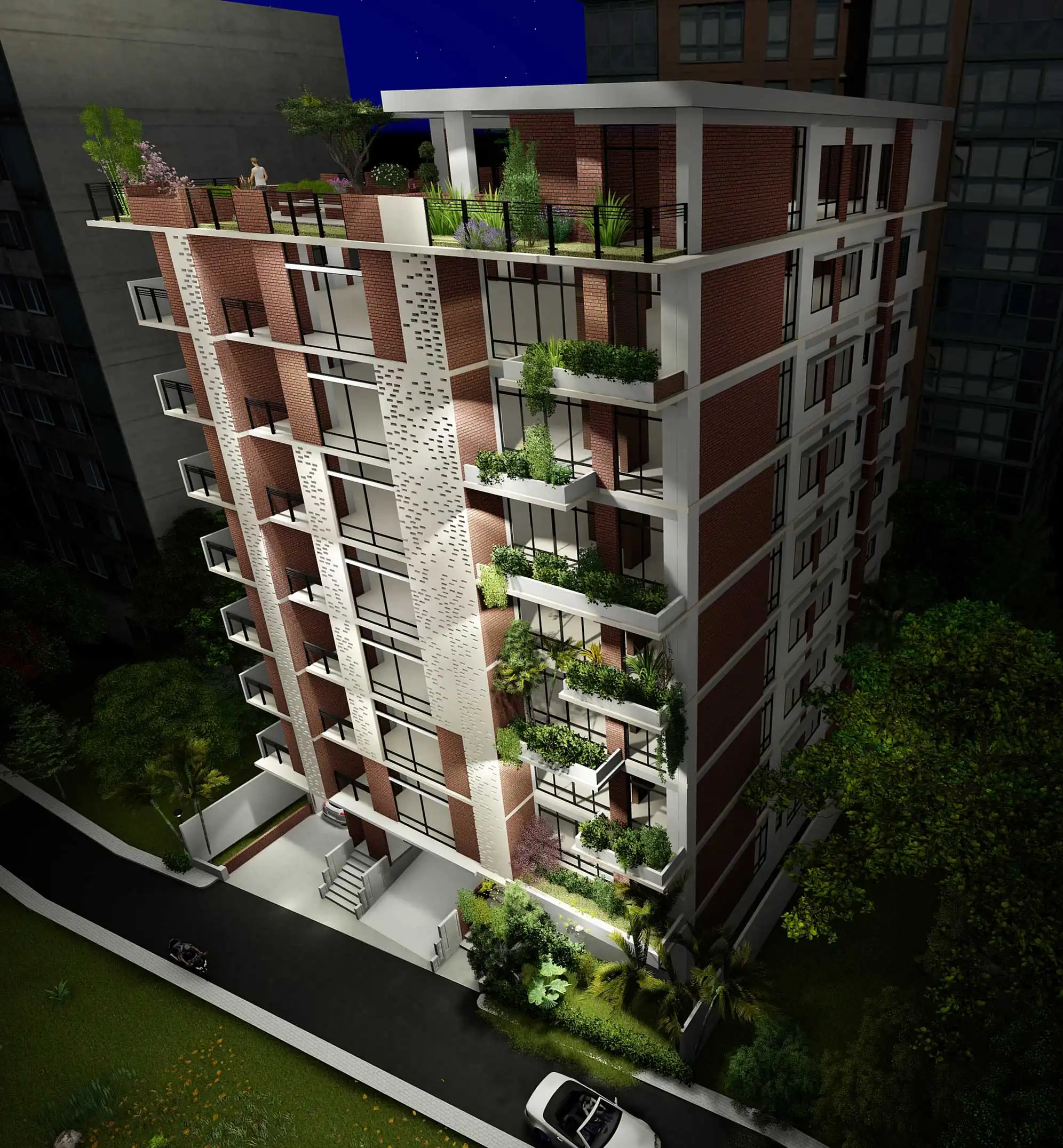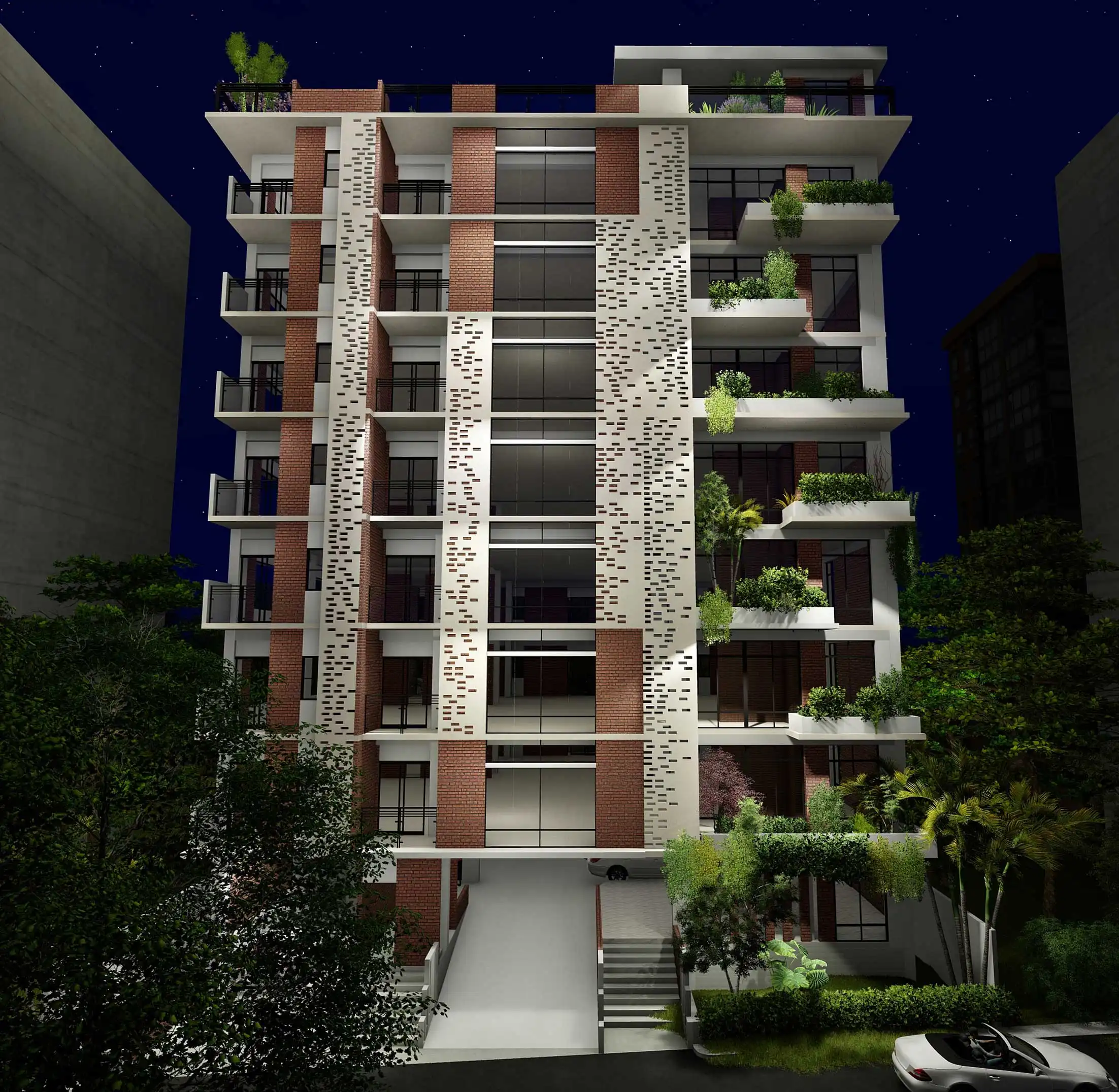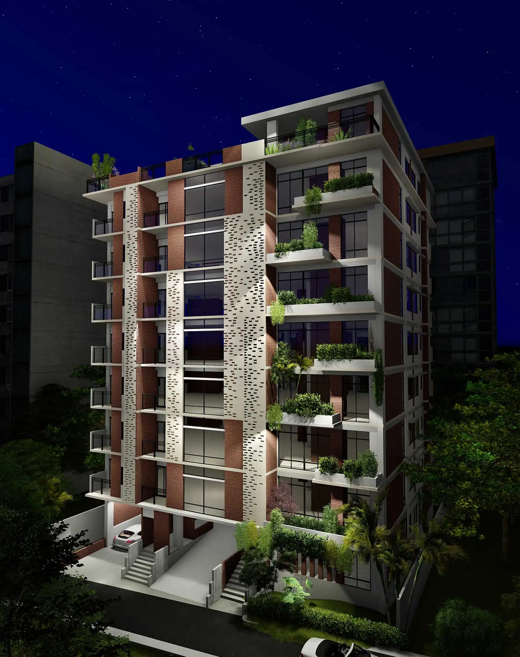 This 10-story residential apartment building, which includes a basement, offers a total floor area of 4205 square feet. Each floor is divided into three residential apartments. Unit-A spans 970 square feet, Unit-B covers 1226 square feet, and Unit-C encompasses 1332 square feet. Unit-A comprises three bedrooms, a living area, a dining area, a kitchen, and two toilets. Unit-B features three bedrooms, a combined living and dining area, a kitchen with a veranda for household staff, and three toilets. Unit-C offers three bedrooms, a spacious living and dining area, a kitchen with a veranda for household staff, and two toilets. The rooftop is designed with natural landscaping and seating areas for residents to enjoy. The building includes a bed-lift and a regular lift for convenience, with a strong emphasis on fire safety measures. The facade of the building is characterized by a unique composition of dots, achieved through the rhythmic placement of bricks. Additionally, the incorporation of dramatic arrangements of planter boxes adds a distinctive dimension to the architectural design.