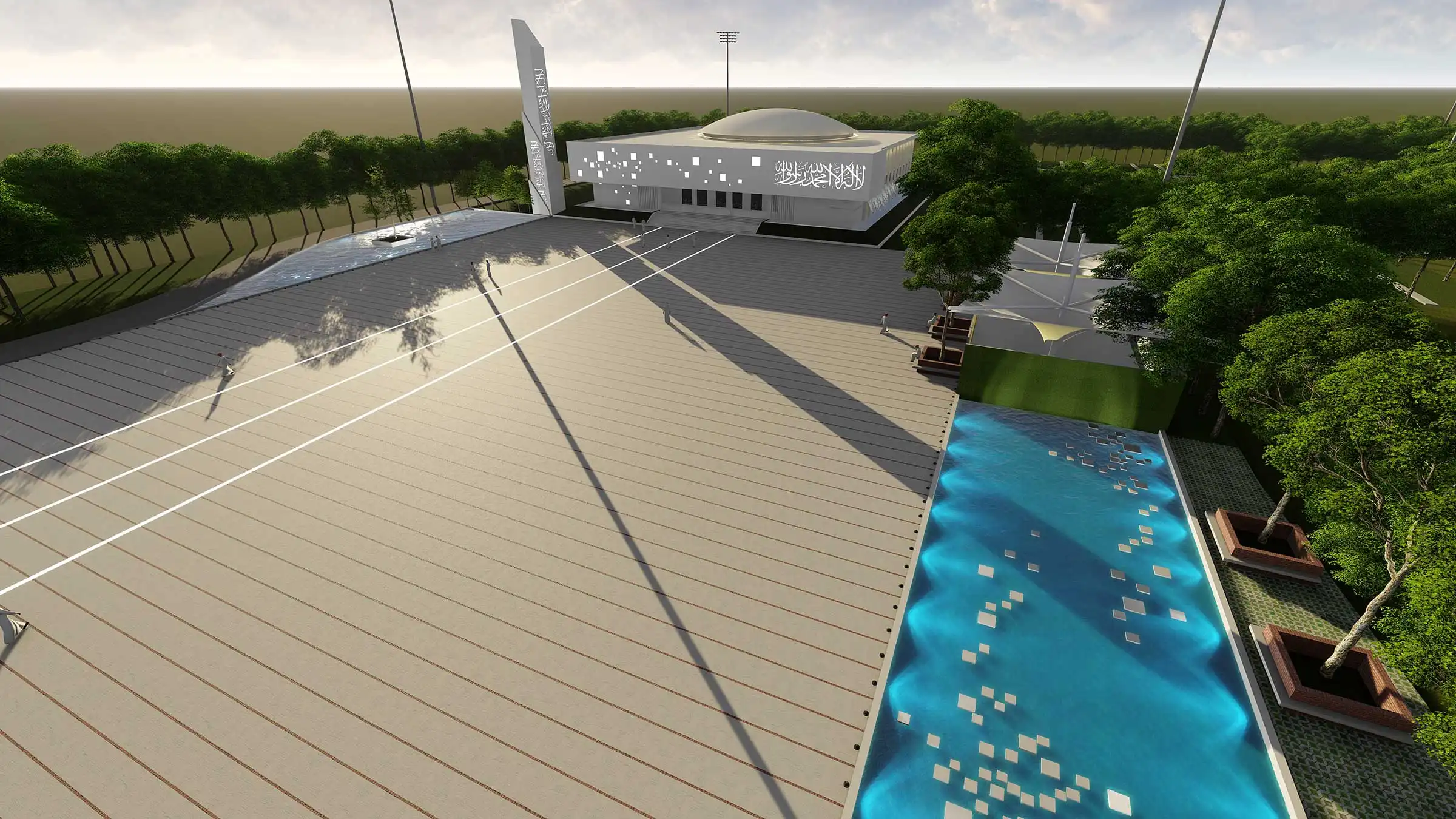 This mosque is designed as a single-story structure, covering an area of 2682 square feet. The primary concept revolves around establishing a seamless connection between the interior prayer space and the surrounding green area. Perforated brick walls have been strategically positioned in alternating locations to create an interplay of light and shadow within the prayer space, complementing the adjacent greenery. Adding to the architectural elements, three glass domes adorn the mosque's roof, enhancing its aesthetic appeal and allowing natural light to filter into the interior spaces.